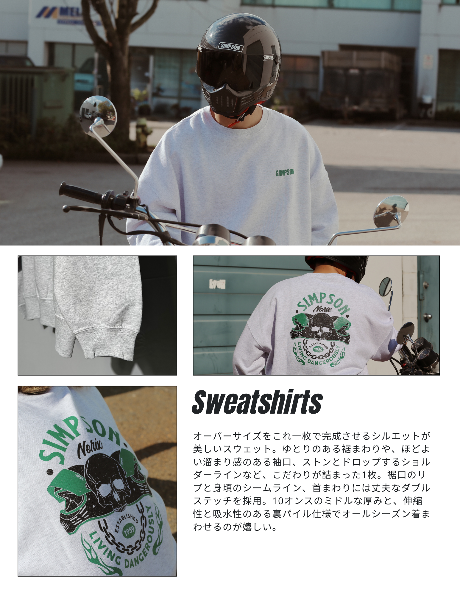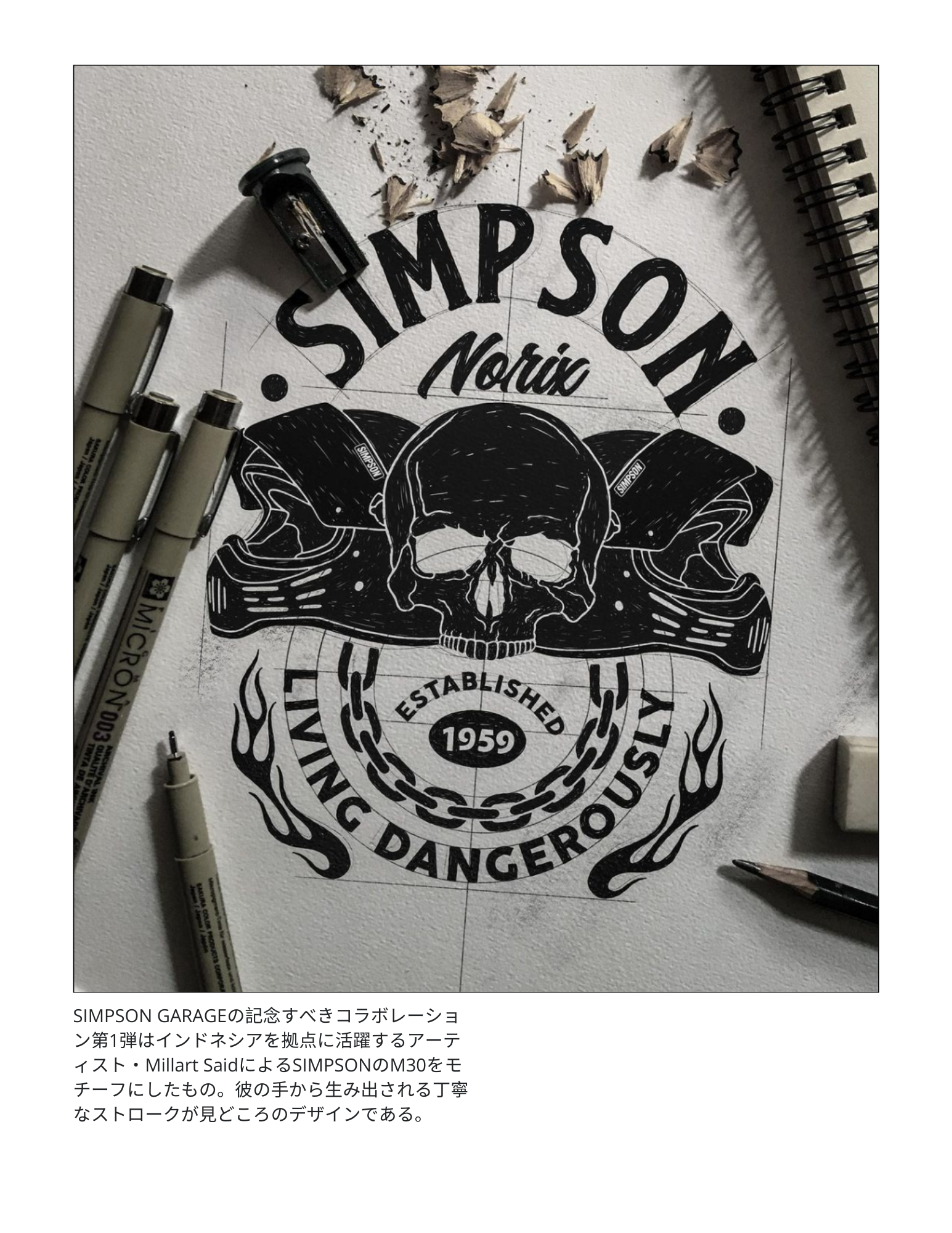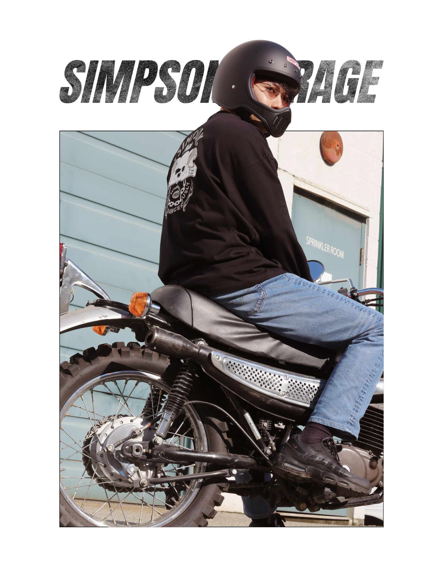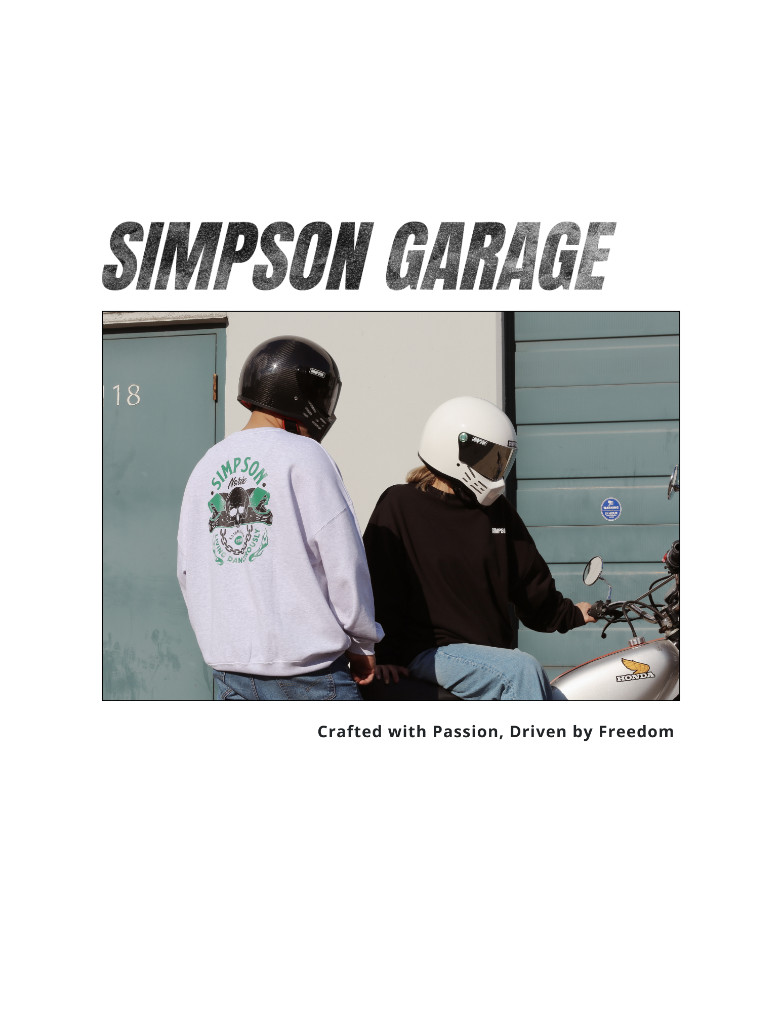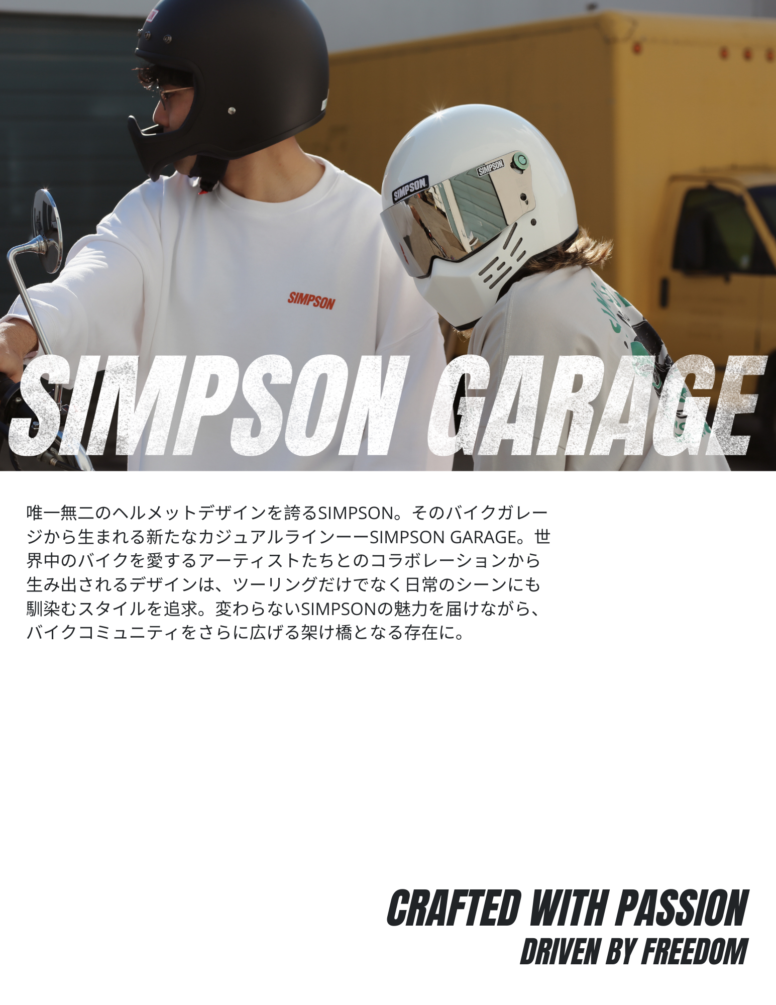 唯一無二のヘルメットデザインを誇るSIMPSON。そのバイクガレージから生まれる新たなカジュアルライン--SIMPSON GARAGE。世界中のバイクを愛するアーティストたちとのコラボレーションから生み出されるデザインは、ツーリングだけでなく日常のシーンにも馴染むスタイルを追求。変わらないSIMPSONの魅力を届けながら、バイクコミュニティをさらに広げる架け橋となる存在に。